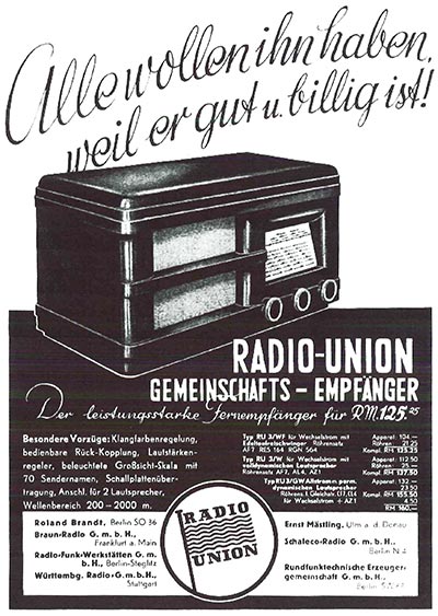 1935 schlossen sich einige Firmen der "Rundfunktechnische Erzeugergemeinschaft G.m.b.H." zusätzlich noch zur "Radio-Union" zusammen um darüber hinaus weitere Gemeinschaftsempfänger herzustellen.