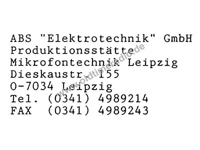 Aus dem ehemaligen Bereich Mikrofontechnik im Leipziger Werk 3 des Kombinates Nachrichtenelektronik "Albert Norden" in Leipzig wurde die Abteilung Mikrofontechnik der "ABS Elektrotechnik GmbH", am gleichen Standort, in der Leipziger Dieskaustr. 155.