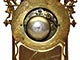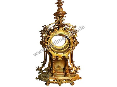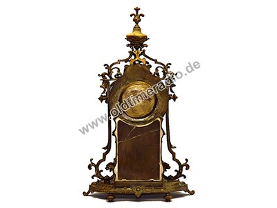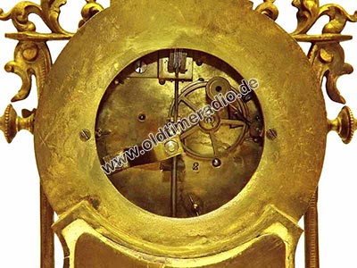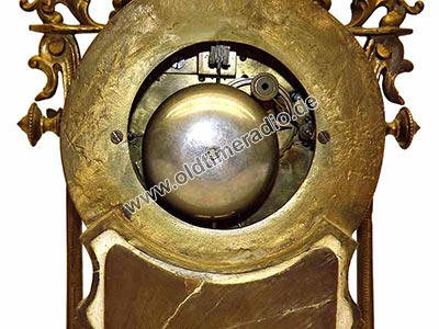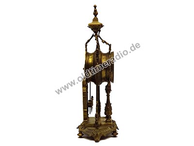 Die Uhr hat ein 8-Tagewerk mit Pendel und Halbstundenschlag auf Glocke. Reich verziertes Gehäuse mit seitlichen Säulen. Email-Zifferblatt mit arabischem Zahlen. Als Zubehör: 1 Schlüssel.