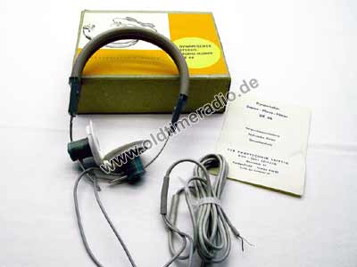 Dynamischer Stereo-/Mono-Kopfhörer, 90 mW, 400 Ω je System, 20 ... 15000 Hz. Bei Mono je nach Stellung der Stecker parallel (200 Ω) oder in Reihe (800 Ω). Die Schallwandler tragen den Schriftzug "Stein".