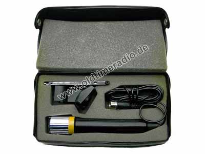 Dynamisches HiFi-Mikrofon. Übertragungsbereich: 50 ... 15000 Hz, Innenwiderstand: 600 Ω, mittelohmiger Eingang 1,8 kΩ. Kugelcharkeristik; mit dreibeinigen Tischständer.