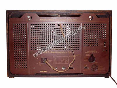 Neben dem Fernsteuerungsanschluss und der Steckdose für externe Geräte gibt es folgende Anschlüsse: externer Lautsprecher 5 Ω, Tonabnehmer oder Tonbandgerät Wiedergabe (3-polig, Mitte flach), Tonbandgerät Aufnahme, (Diodenausgag) (Klinkenbuchse). Und natürlich Antenne/Erde.