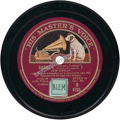 Weitere Bemerkungen auf Etikett (außer Titel): VIOLIN with Piano, Record manufactured by THE Gramophone Co., LTD., Hayes . Middlesex. England.