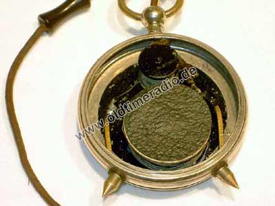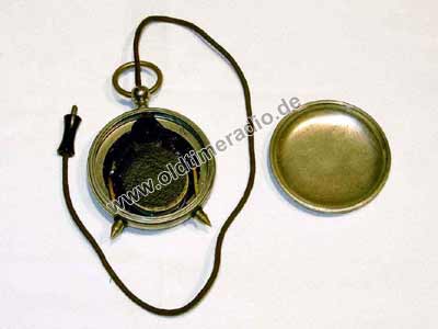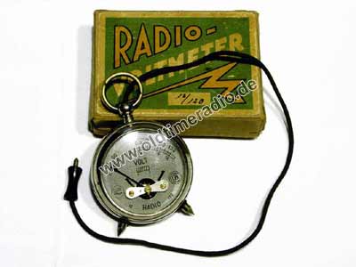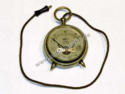 Das Voltmeter ist "standesgemäß" in einem Taschenuhrengehäuse eingebaut (siehe Hersteller).