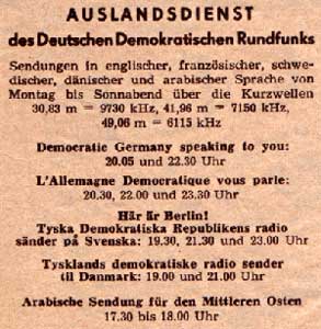 Am 20.03.1954 begann der DDR-Rundfunk seinen Auslandsdienst. Mit der Zuspitzung des kalten wurden neue Kurzwellenzentren in beiden deutschen Staaten aufgebaut. Als "Die Stimme der Frauen der Welt" wurde, vorerst nur montags, 19:00 Uhr in Französisch, 19:10 Uhr in Deutsch und von 19:20-19:30 Uhr in englischer Sprache gesendet.