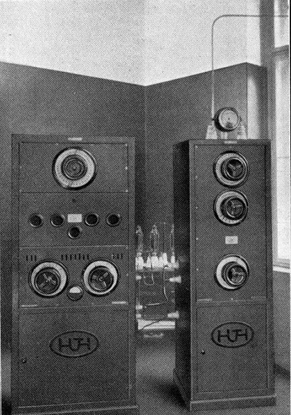 Der linke Teil diente zur Schwingungserzeugung, Modulation, Frequenzeinstellung und Kontrolle der Heizung für die Senderöhren. Zwischen den beiden Schränken ist ein Teil des Gleichrichter-Aggregats zu sehen.