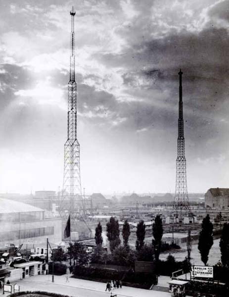 Zwei Stahlgittermasten, 105 m hoch in 113 m Entfernung mit dazugehörigem Senderhaus bildeten eine eindrucksvolle Antennenanlage.