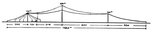 Von den Randmasten hatten sechs Stück eine Höhe von 210 m (Gewicht 130 t) und zwei eine Höhe von 150 m).