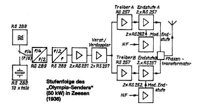 Die Sender trugen die bekannte Bezeichnung "Olympia Sender". Eine Kombination von Parallel- und Gegentaktschaltung von vier Senderöhren des Typs RS 257 ermöglichte die hohe Sendeleistung.
