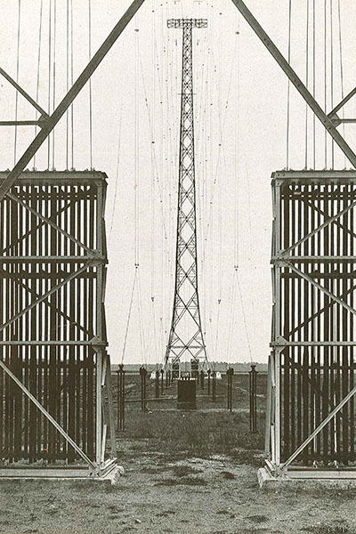 1932 bekam dieser Holzturm noch eine zweite Rundstrahlantenne um Tag und Nacht auf verschiedenen Frequenzen arbeiten zu können.