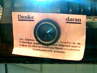 Nach dem 2. Weltkrieg erhielt Deutschland von den damaligen Alliierten (USA, GB, UdSSR, Frankreich) strenge Auflagen zur "Entnazifizierung". Die Nicht-Einhaltung war eine Straftat und wurde z.B. mit Zuchthaus bestraft. Davon waren auch die Gemeinschaftsempfänger betroffen. Aus diesem Grund mussten die Hoheitszeichen (Hakenkreuz) auf den Außenseiten der Geräte entfernt werden. Man findet folglich heute kaum mehr Geräte ohne diese nachträgliche Veränderung, Dies ist Teil der Geschichte und keinesfalls wertmindernd! Eine "Entnazifizierung" im Inneren der Geräte musste nicht erfolgen und war nicht strafbar.