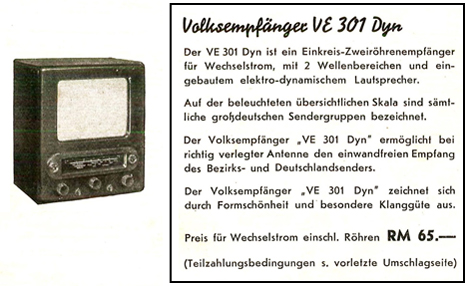 Es gab auch hier die Möglichkeit zur Ratenzahlung. Bei 5.- RM Anzahlung konnte das Gerät z.B. in 15 weiteren Raten zu je 2,30 RM abbezahlt werden. Die Finanzierungsbedingungen finden sich weiter oben beim VE 301 dyn.