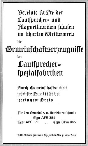 Im Katalog "Deutsche Rundfunkgeräte Jahrgang 1938-39 der Fachgruppe Rundfunk der Wirtschaftsgruppe Einzelhandel findet sich folgende Anzeige: