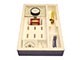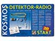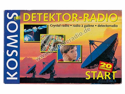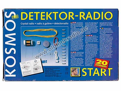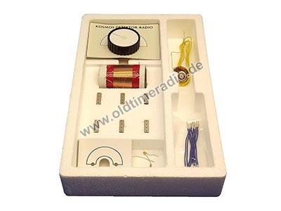 Experimentierkasten aus Styropor für 20 Versuche mit Spule, Drehko, Germanium-Diode, 3 Kondensatoren, 1 Widerstand und Kristall-Ohrhörer. Verbindungen mit Drahtbrücken und Klemmfedern.