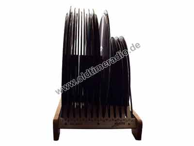 Dieser Schallplattenständer ordnet die Schallplatten, nicht wie üblich in einer Reihe, sondern in wechselnder Folge. Dadurch können die Platten besser gegriffen werden. Aufschrift: Ges. gesch., Marma.