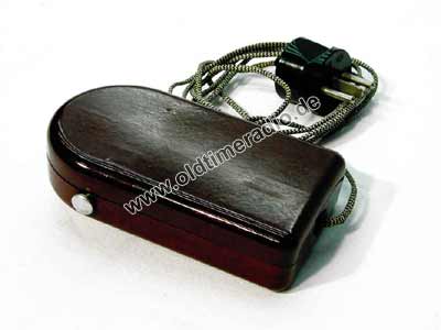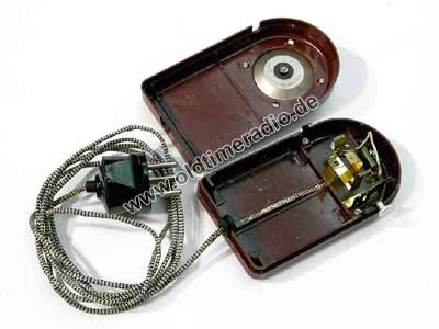 Telefon-Kohlegrieß-Mikrofonkapsel, 4,5-V-Flachbatterie und Druckkontakt im Gehäuse einer Taschenlampe. Anschluss an Radio-TA-Buchsen.