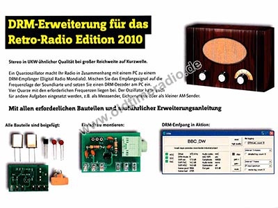 Diese Baugruppe ermöglichte den Empfang von DRM-Sendern in Verbindung mit dem Kurzwellen-Bausatz-Radio von Conrad, einem PC mit Soundkarte und entsprechender Decoder-Software. Sie arbeitete auf der Basis eines Quarz-Oszillators welcher auch für andere Aufgaben eingesetzt werden kann, z.B als AM-Messsender, Eichgenerator oder als kleiner AM-Sender.