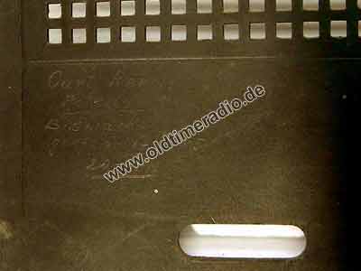 Bei seiner Herstellung 1938 wurden folgende Beschriftungen angebracht: Kennzeichen "N/A No 74325". Aufkleber Seitenwand innen: "Dieses Gerät darf nur für Rundfunkempfang u. Schallplattenwiedergabe, jedoch nicht im Gleichlauf mit Bildfilmen und nicht für andere Zwecke verwendet werden". Prägung Gehäuse innen: "Reichsrundfunk W/D 94 RJ", Prägungen Rückwand: "Reichsrundfunk W/D 99 RJ".