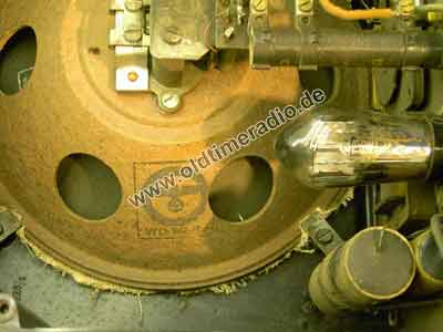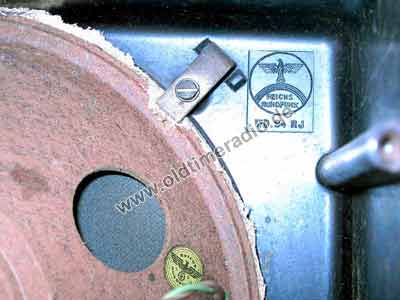 Im zarten Radioalter von 6 - 7 Jahren (in dem ein Mensch seine Milchzähne verliert) erhielt Deutschland von den damaligen Alliierten (USA, GB, UdSSR, Frankreich) strenge Auflagen zur "Entnazifizierung". Die Nicht-Einhaltung war eine Straftat und wurde z.B. mit Zuchthaus bestraft. Davon war auch dieses Radio betroffen. Hierzu wurde das Emblem (Hakenkreuz) auf der Vorderseite des Gehäuses sehr sorgfältig heraus geschliffen und dabei, glücklicherweise, kein weiterer Schaden gemacht. Der DKE hätte nicht wieder verkauft werden dürfen wenn er nicht auch "entnazifiziert" wurde. Diese nachträgliche Veränderung ist Teil der Geschichte und keinesfalls wertmindernd! Eine "Entnazifizierung" im Inneren des Gerätes erfolgte nicht.