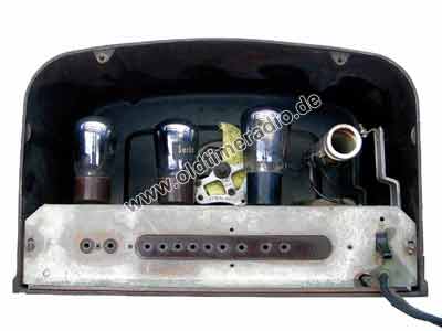 Anschlüsse für Antenne (5x), Erde, Plattenspieler, Lautsprecher (T), Abstimmdreko, Skale 0...100 mit Sendernamen. Weitere Abstimmung für Rückkopplung und Kurz/Lang.