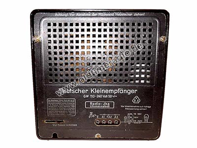 Der "Deutsche Kleinempfänger" und sein Vorgänger "Deutscher Kleinempfänger 1938" wurde im Volksmund als "Goebbelsschnauze" bezeichnet. Dieses Radio wurde als "Gemeinschaftsempfänger" im besetzten Polen hergestellt. Das Gehäuse aus Preßstoff (Bakelit) ist dunkelbraun. Die Umschaltung des Empfangsbereiches erfolgte selbsttätig beim Durchdrehen des Abstimmrades, ohne Anschlag. Der Schalter befindet sich auf dem Abstimmdrehko aus Trolitul (Papier-Drehkondensator) und wird über eine Nockenscheibe betätigt.