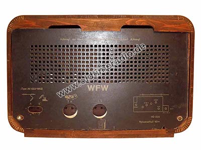 Interessante Details der Skala: Sie trägt den Typenaufdruck E/653/WLK (ähnliches Modell, ab 1952, mit E-Röhren), offensichtlich wurde sie für mehrere Typen verwendet. Außerdem wurde sie nach Druck "zensiert". Die Sendeplätze "Berlin W." (RIAS) wurden entfernt und danach auf der Rückseite geschwärzt.