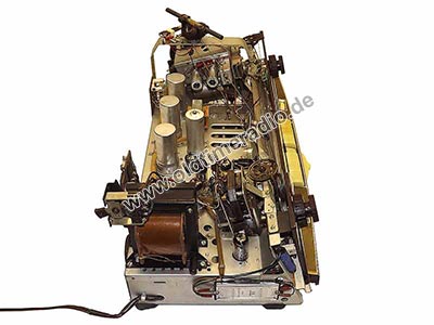 Neben dem Fernsteuerungsanschluss und der Steckdose für externe Geräte gibt es folgende Anschlüsse: externer Lautsprecher 5 Ω, Tonabnehmer oder Tonbandgerät Wiedergabe (3-polig, Mitte flach), Tonbandgerät Aufnahme, (Diodenausgag) (Klinkenbuchse). Und natürlich Antenne/Erde.