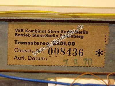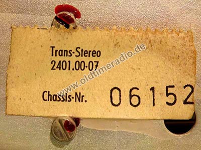 Das Chassis trägt zwei aufgeklebte Typenschilder: 1.: Transstereo 2401.00, Chassis-Nr.008436 vom 7.9.70 mit der Firmenbezeichnung VEB Sternradio Sonneberg und 2.: Trans-Stereo 2401.00-07, Chassis-Nr. 06152 ohne Firmenbezeichnung.