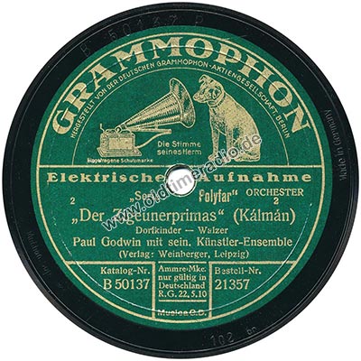 Weitere Bemerkungen auf Etikett (außer Titel): Die Stimme seines Herrn, eingetragene Schutzmarke, ORCHESTER, 2, Ammre-Mke. Nur gültig in Deutschland R.-G. 22.5.10, MUSICA G.D.