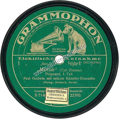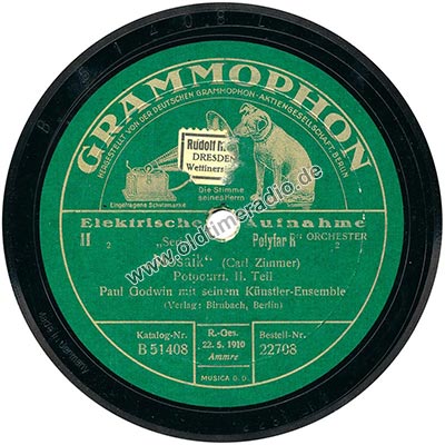 Weitere Bemerkungen auf Etikett (außer Titel): Die Stimme seines Herrn, eingetragene Schutzmarke, ORCHESTER, 2, R.-Ges. 22.5.1910, Ammre, MUSICA G.D.