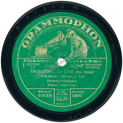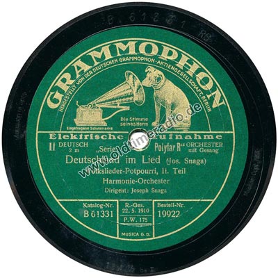 Weitere Bemerkungen auf Etikett (außer Titel): Die Stimme seines Herrn, eingetragene Schutzmarke, DEUTSCH, ORCHESTER mit Gesang, 2m, Elektrische Aufnahme, R.-Ges. 25.5.1910, P.W. 175, MUSICA G.D.