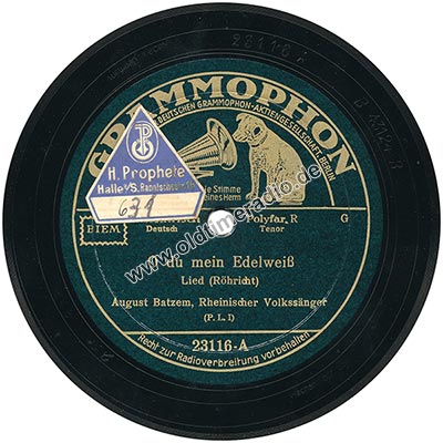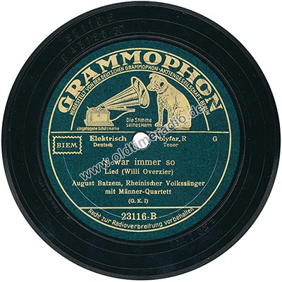 Weitere Bemerkungen auf Etikett (außer Titel): Die Stimme seines Herrn, eingetragene Schutzmarke, Elektrisch, Deutsch, Tenor, G, Recht zur Radioverbreitung vorbehalten
