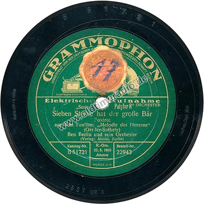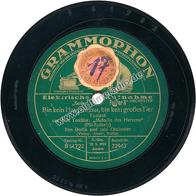 Weitere Bemerkungen auf Etikett (außer Titel): Die Stimme seines Herrn, eingetragene Schutzmarke, ORCHESTER, 2, R.-Ges. 22.5.1910, Ammre, MUSICA G.D.