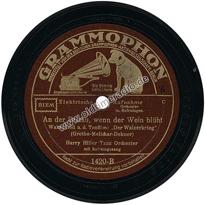 Weitere Bemerkungen auf Etikett (außer Titel): Die Stimme seines Herrn, eingetragene Schutzmarke, Elektrische Aufnahme, Orchester m. Refraingesang, C, BIEM. Recht zur Radioverbreitung vorbehalten