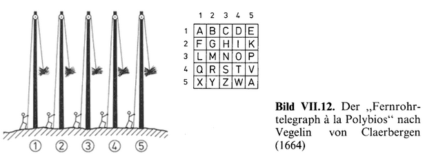 1659 Vegelin van Claerbergen in Nassau erfindet einen optischen Telegrafen, bei dem tagsüber an hohen Stangen Heubündel oder Flaggen, bei Nacht Laternen, aufgezogen waren.