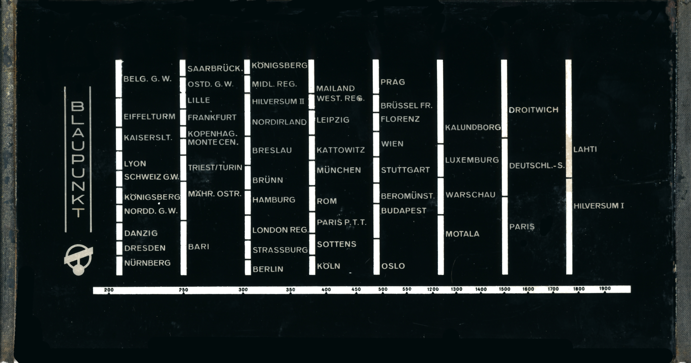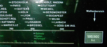 Skala nach Kopenhagener Wellenplan: Am langwelligen Ende des MW-Bereiches liegen die Stationen in der Reihenfolge Wien - Budapest - Beromünster