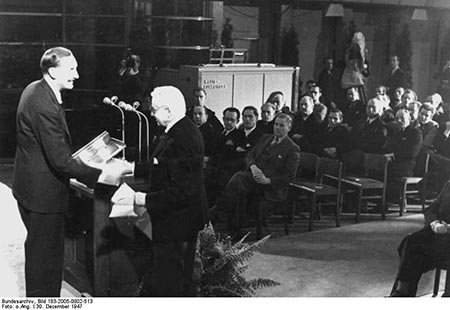 Am 31.12.1947 wurde in einer Feierstunde im großen Sendesaal in Hamburg der "NWDR" in deutsche Hände übergeben. Mit der Übergabe einer Satzung erfolgte die Umwandlung in eine Anstalt des öffentlichen Rechts für die Bundesländer Hamburg, Niedersachsen, Schleswig-Holstein, Nordrhein-Westfalen und Berlin.