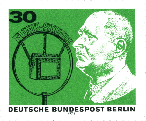 Hans Bredow vor einem Mikrophon der Funk-Stunde (Briefmarke der Deutschen Bundespost Berlin von 1973).
