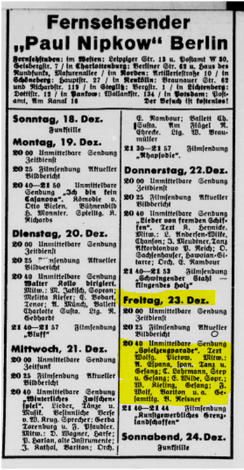 Hier das Fernsehprogramm der Woche vom 18. - 24.12.1938: