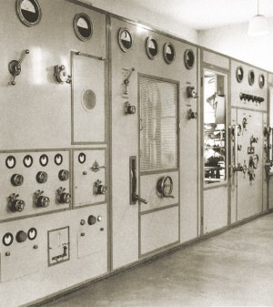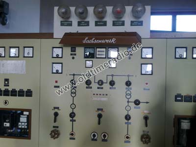 Maschinensaal: Im Hintergrund die beiden Hochspannungsgleichrichter für 13 kV, dazwischen die Bedientafel