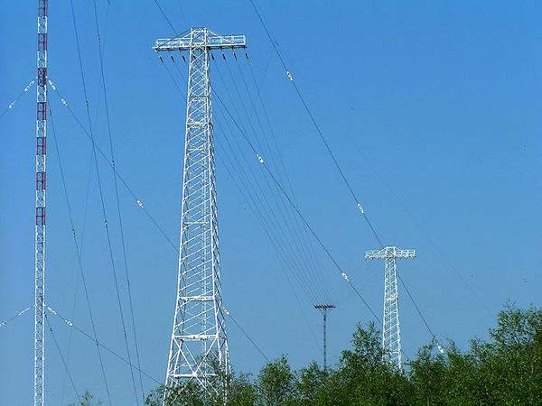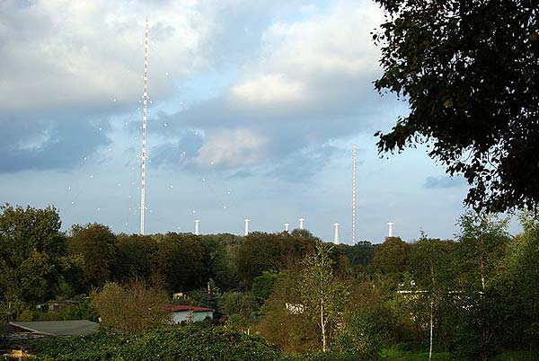 Dreieckflächenantenne für Mittelwelle auf drei 55 m hohen abgespannten Stahlgittermasten.