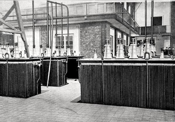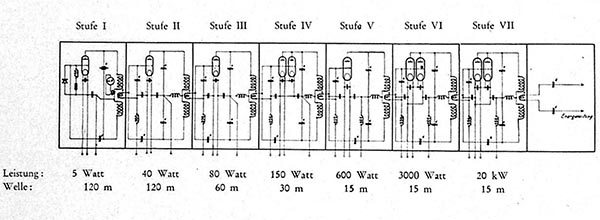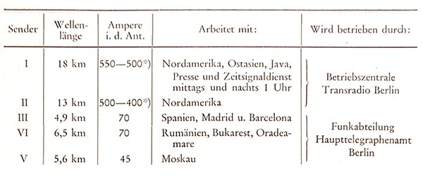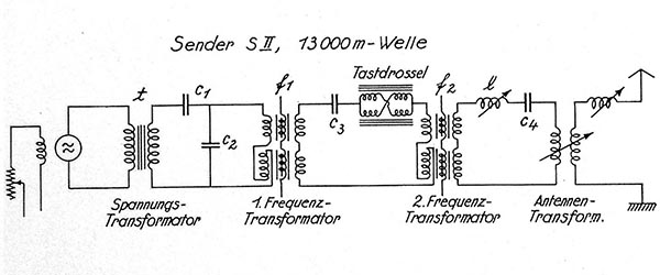 Der gelieferte Strom wurde durch Transformatoren, Hochfrequenzmaschinen, Frequenzwandler usw. so verändert, dass er als hochfrequenter Strom in Form von Telegraphierzeichen oder Telephonie in die Welt hinaus gesendet werden konnte.