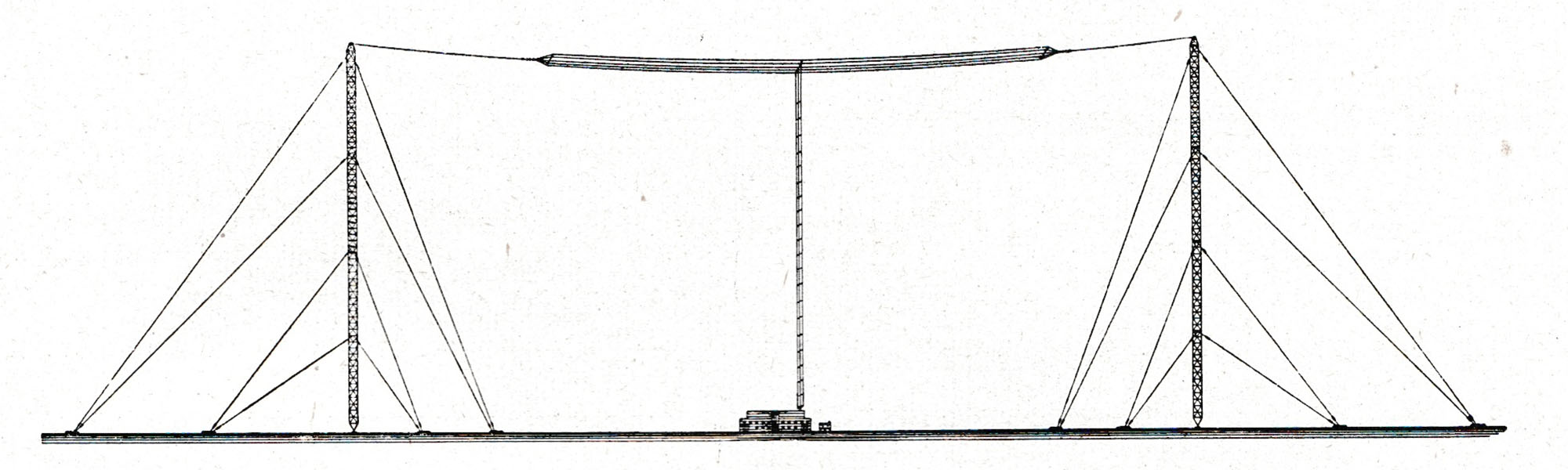 Die Antenne wurde von zwei abgespannten isolierten Eisengittermasten von je 210 m Höhe getragen, die in einem Abstand von 450 m aufgestellt waren.