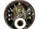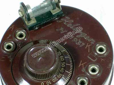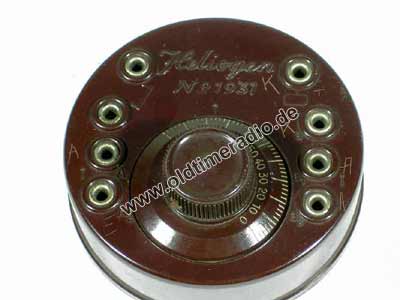 Runde Dosenform, Drehkondensator, Kurzschlussbügel zur Wellenumschaltung.