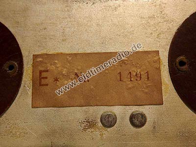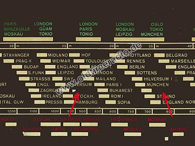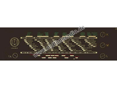 Interessante Details der Skala: Sie trägt den Typenaufdruck E/653/WLK (ähnliches Modell, ab 1952, mit E-Röhren), offensichtlich wurde sie für mehrere Typen verwendet. Außerdem wurde sie nach Druck "zensiert". Die Sendeplätze "Berlin W." (RIAS) wurden entfernt und danach auf der Rückseite geschwärzt.