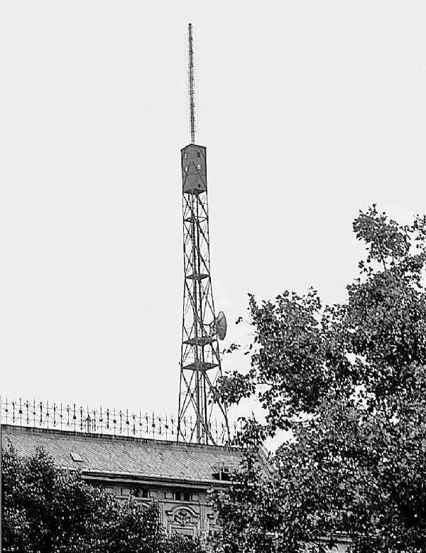Auf dem Flachdach wurde ein etwa 46 m hoher Stahlgitterturm als Antennenträger errichtet.