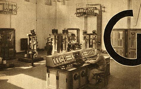 Maschinensaal: Im Hintergrund die beiden Hochspannungsgleichrichter für 13 kV, dazwischen die Bedientafel
