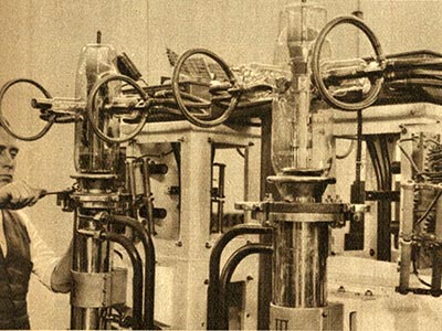 Bei der Montage der Senderöhren für je 150 kW Leistung. Auch die Heizzuführungen sind wassergekühlt