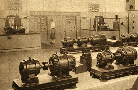 Maschinensaal: Hinten die Maschinenschalttafel, rechts die großen Heizumformer 45 V, 2.600 A